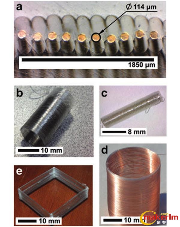 如圖所示,該結(jié)構(gòu)使用FEAM工藝打印,圖A是外徑25.4毫米螺旋線的剖面特寫顯微鏡照片;圖B、圖C分別是13毫米、4毫米外徑的鑷絲螺旋線圈;圖D為25毫米外徑銅絲螺旋線圈;圖E是26毫米寬、角線半徑600微米的方形線圈。